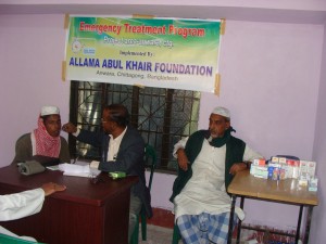 The program on emergency treatment was arranged in April 2011 to provide health service to the poor people who are suffering from eye affects and diabetics and different diseases. As a consequence of increase in costs in health services and price hike of daily commodities in rural areas in Bangladesh poor people are not affording basic treatment from doctors. Mostly, old people are vulnerable from this situation. With this background Allama Abul Khair Foundation has decided to arrange a program to provide health service to poor people. For this it hired doctors on program basis to provide health service to poor patient, especially students from poor family suffering from various diseases. The foundation also provided medicines to the patients according the prescription of the doctors. AAKF thanks to those who came forward to implement this initiative.This foundation frequently manages healthcare for the deprived people.